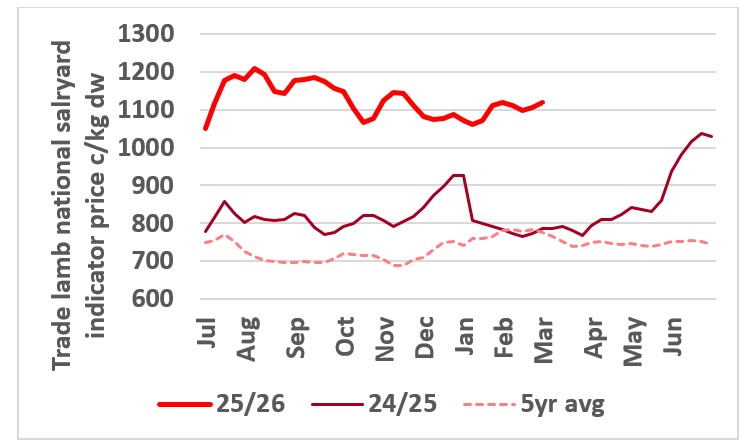 This chart shows the national saleyard indicator prices for trade lambs in 24/25 vs 25/26 vs 5year average. Source: MLA.
