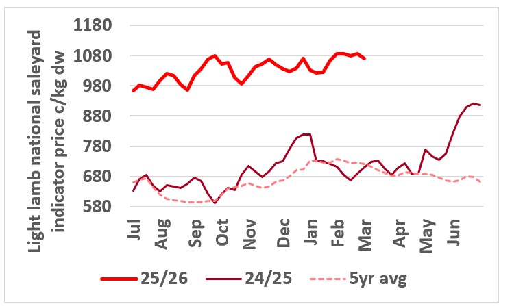 This chart shows the national saleyard indicator prices for light lambs in in 24/25 vs 25/26 and 5-year average. Source: MLA.
