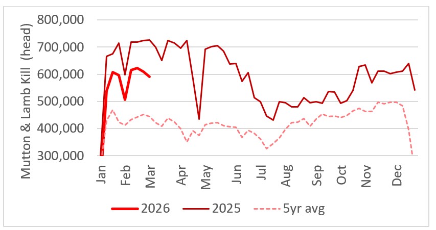 Chart shows combined lamb and mutton kill 2025 vs 2026 and 5year average. Source: MLA