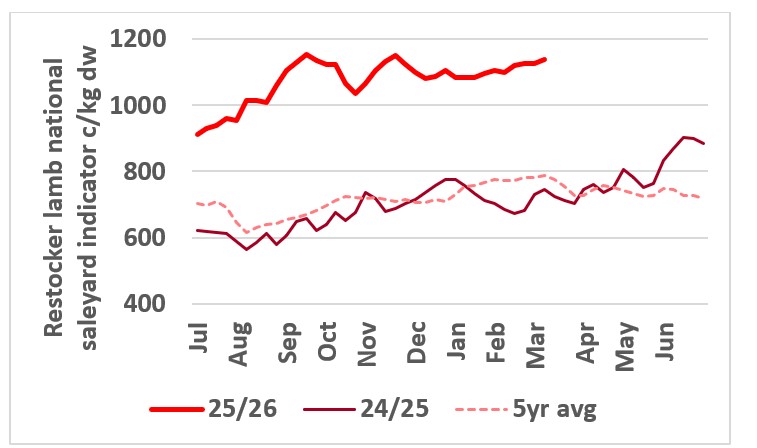 This chart shows the national saleyard indicator for restocker lambs in 24/25 vs 25/26 and 5-year average. Source: MLA.