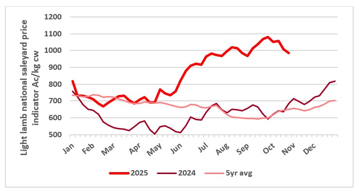 This chart shows the national saleyard indicator prices for light lambs in 2025 vs 2024 vs five-year average. Source: MLA