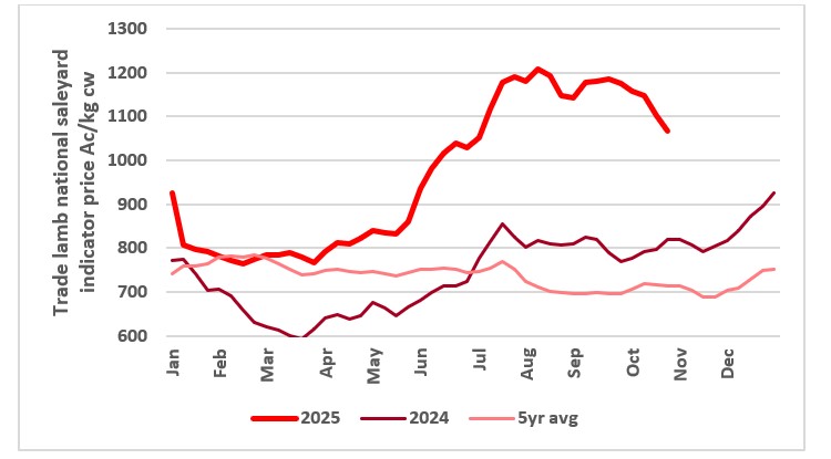Expect increased numbers of store lambs to hit the markets through November and December, potentially leading to lower store lamb values. The lack of slaughter weight lambs will continue to support heavy export and trade lamb values through to the end of the year.