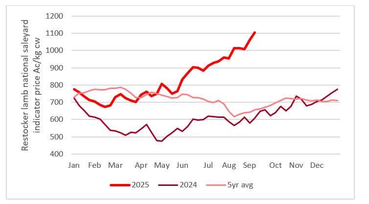 This chart shows the national saleyard indicators prices for restocker lambs this year vs 23/24 and 7-year average. Source: MLA.