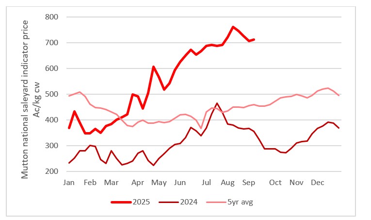 This chart shows the national saleyard indicators prices for mutton this year vs 23/24 and 7-year average. Source: MLA.