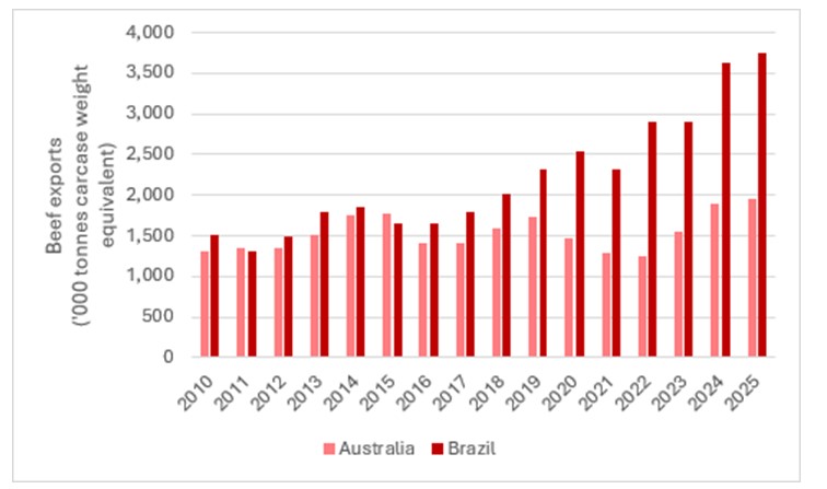 This chart shows annual beef exports from Brazil vs Australia. Source: USDA.