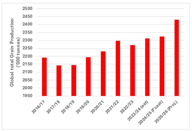 This chart shows global production of major grains in ‘000 tonnes per summer cropping period from 2016 to 2025/2026. Source: International Grains Council.