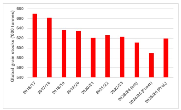 This chart shows global end stocks of major grains per summer cropping period from 2016 to 2025/2026 in ‘000 tonnes. Source: International Grains Council.