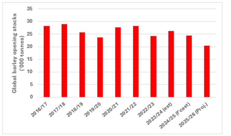 This chart shows global barley opening stocks per summer cropping period from 2016 to 2025/2026 in ‘000 tonnes. Source: International Grains Council.