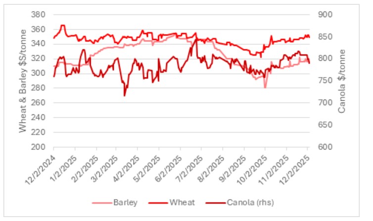 While nearby market sentiment for cereals is weak, the vibe across the oilseed complex may be even worse. Oilseed stocks in Canada and the US are mounting as harvest wraps up and as Chinese demand for oilseeds shifts from north to south America due to ongoing trade disputes. Australian exporters are keenly awaiting some Chinese canola buying as China looks to replace Canadian canola, with discussions between Chinese and Australian officials aimed at finalising export protocols ongoing. The potential for large shifts in trade flows from sudden changes in trade policy will keep the oilseed market on edge entering 2026.