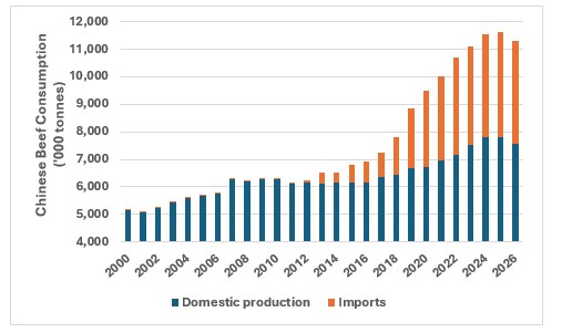 To protect its domestic beef industry, the Chinese Government will restrict beef imports to 2.7 million tonnes in 2026, roughly in line with the record 2.87 million tonnes it imported in 2024. Restrictions will be applied through country specific quotas with exports above country specific quotas levied at a prohibitive 55 per cent (pc) tariff.