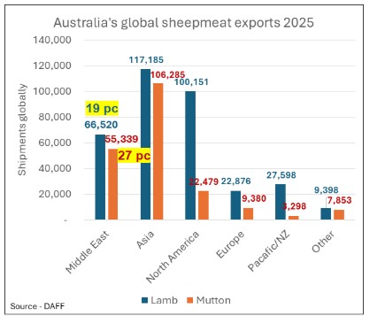 The Middle East takes 19 per cent (pc) of Australia’s lamb exports and 27 pc of mutton exports. The lamb exports are dominated by light lamb carcase airfreight.