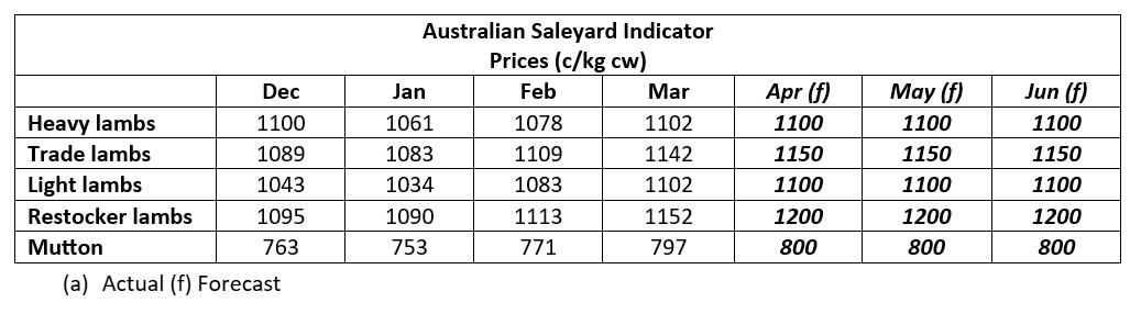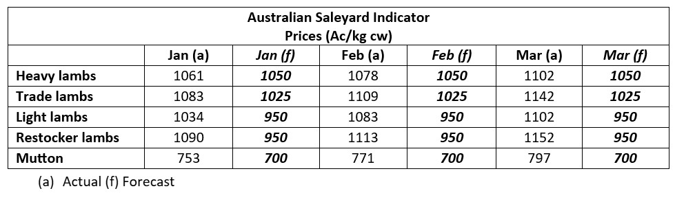 Table comparing actual vs forecast figures for Australian sheepmeat saleyard indicator price January to March 2026. Source: Meat Australian dollar Livestock Australia (MLA), Elders forecasts (f).