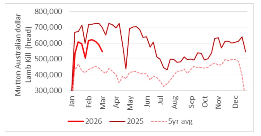 This chart shows Australian weekly sheepmeat slaughter in 2025 vs 2026 Australian dollar the 5-year average. Source: NLRS