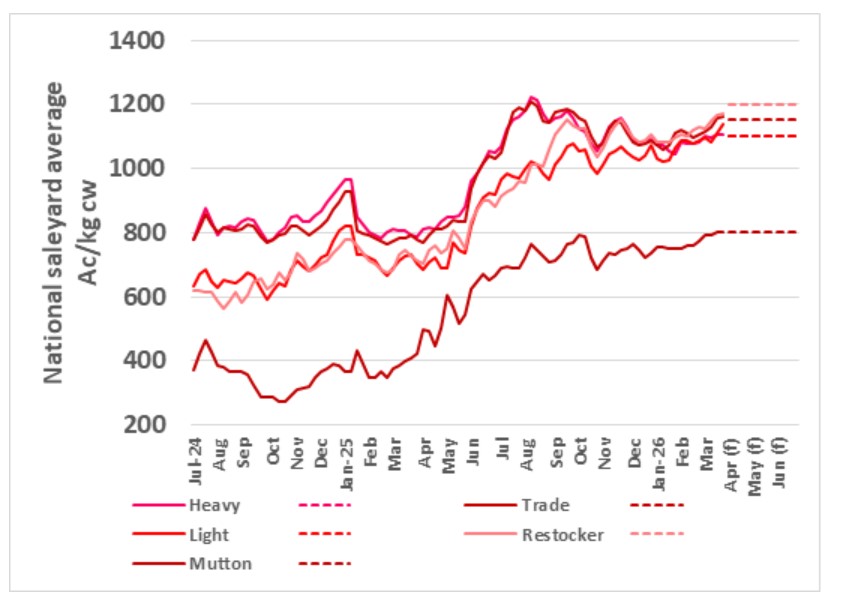 Lambs have moved to an all-time high trading range between $11 to $12/kg dressed weight (dw) and sheep to $7.50 to $8/kg dw. This has pushed values 50 cents to $2/kg cw above our summer price forecasts. Pastoral areas that have been a major source of supply for the processors and southern feeders have effectively closed the gate to rebuild numbers, turning them from sellers to buyers, contributing to price strength across restocker and light lamb categories.